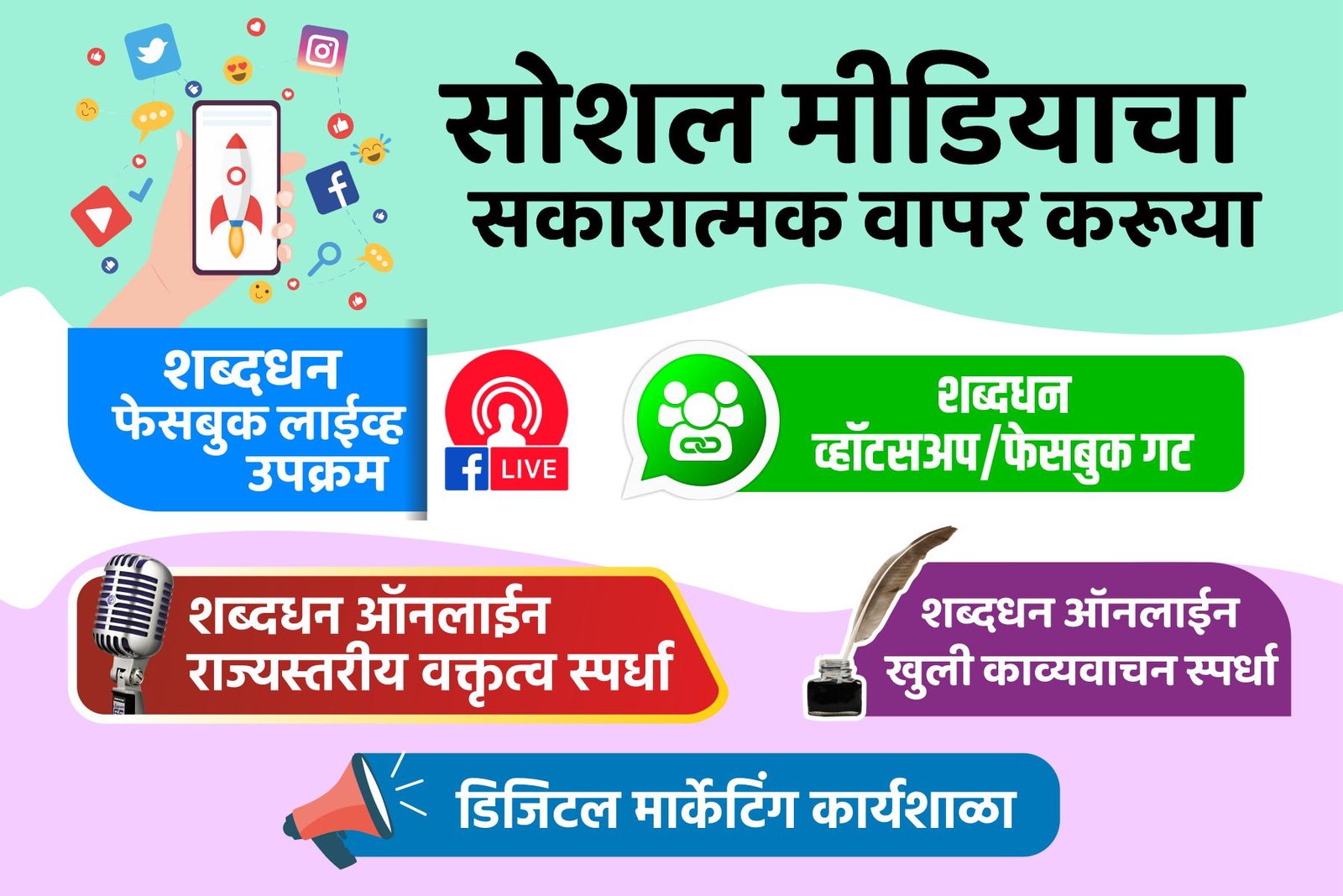 शब्दधन सोशल फाऊंडेशन या संस्थेच्या माध्यमातून सोशल मीडियाचा सकारात्मक वापर करूया हा उपक्रम राबवला जातो.