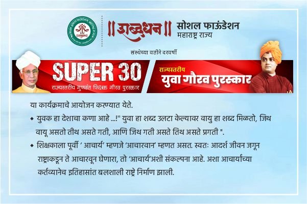 शब्दधन सोशल फाऊंडेशन महाराष्ट्र राज्य संस्थेच्या वतीने दरवर्षी राज्यस्तरीय युवा गौरव पुरस्कार व SUPER 30 राज्यस्तरीय गुणवंत शिक्षक गौरव पुरस्कार या कार्यक्रमाचे आयोजन करण्यात येते.