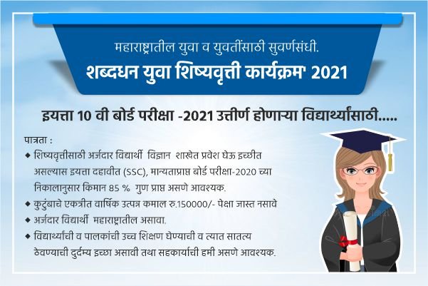 - शिष्यवृत्तीसाठी अर्जदार विद्यार्थी विज्ञान शाखेत प्रवेश घेऊ इच्छीत असल्यास इयत्ता दहावीत (SSC), मान्यताप्राप्त बोर्ड परीक्षा-२०२० च्या निकालानुसार किमान ८५ % गुण प्राप्त असणे आवश्यक.